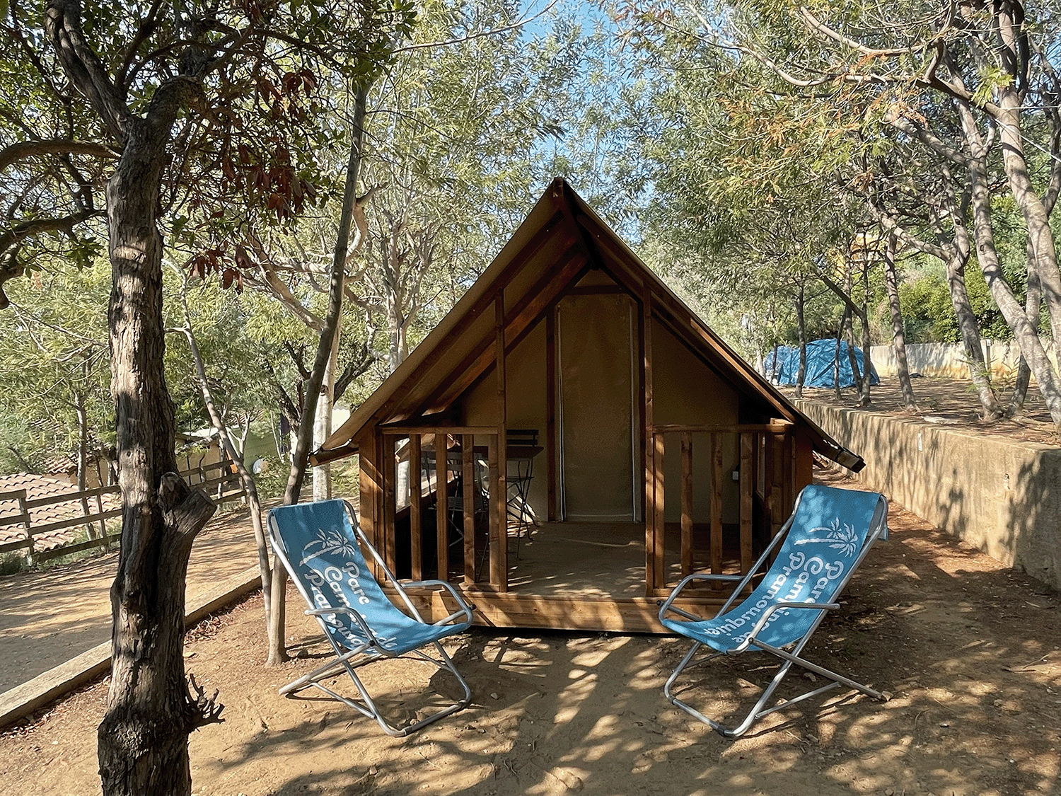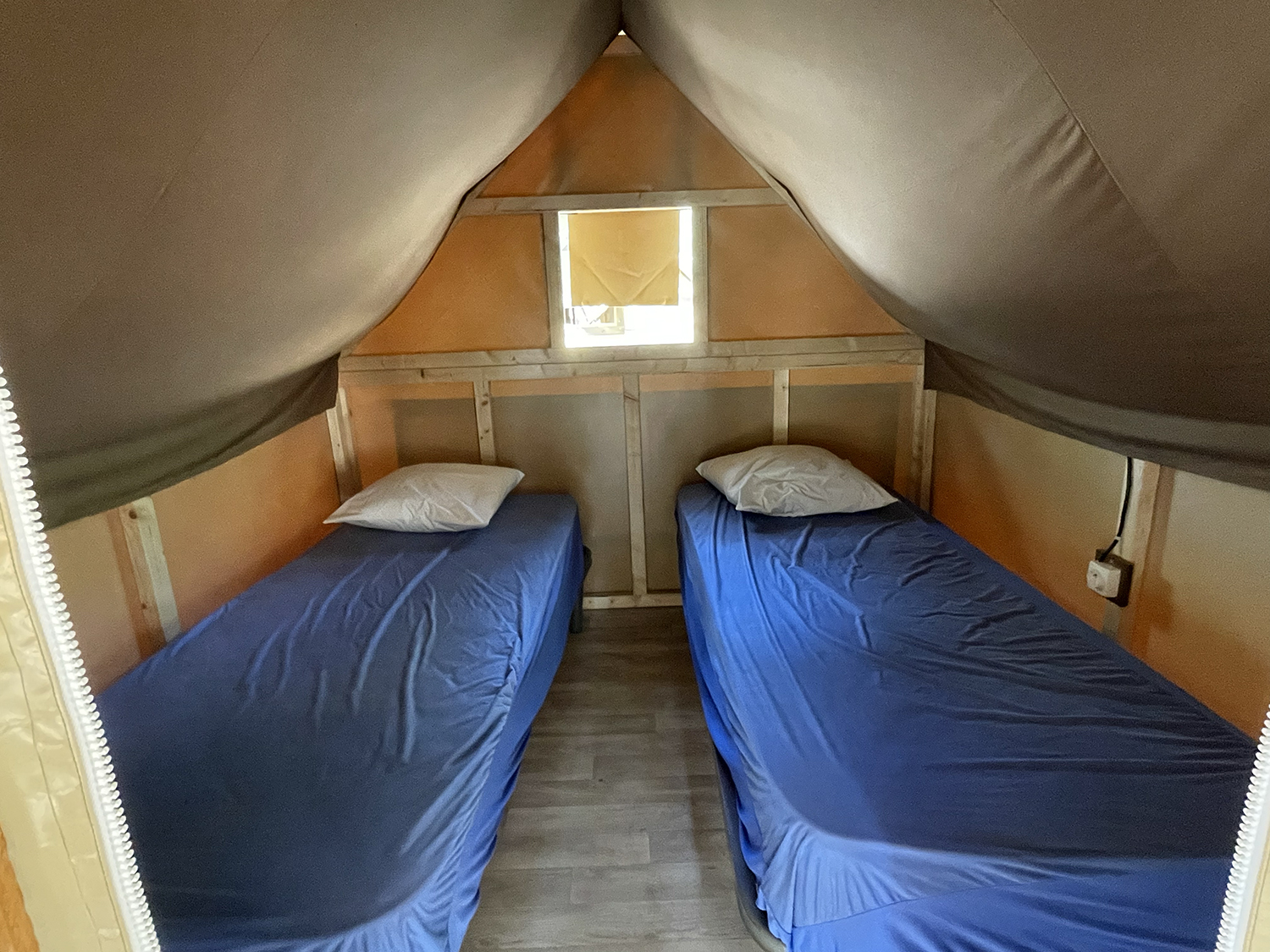 Tente aménagée sur un plancher en bois, équipée d’une petite terrasse extérieure semi-couverte, et d’une chambre avec deux lits jumeaux. Un coffre à vélos se trouve à l’arrière de la tente.